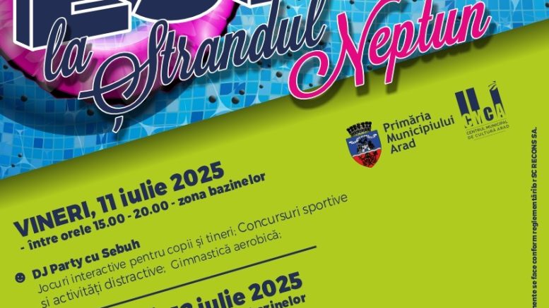Evenimentul Arad Estival va continua la Ștrandul Neptun din Arad, în perioada 11 – 13 iulie, când au fost pregătite mai multe evenimente în zona bazinelor.