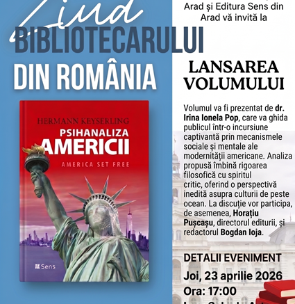Aradul cultural se pregătește pentru un moment editorial de excepție. Joi, 23 aprilie 2026, începând cu orele 17:00, Sala de Arte a Bibliotecii Județene „Alexandru D. Xenopol” va deveni spațiul unei dezbateri fascinante despre mecanismele care pun în mișcare lumea modernă, cu ocazia lansării volumului „Psihanaliza Americii”, semnat de marele gânditor Hermann Keyserling.