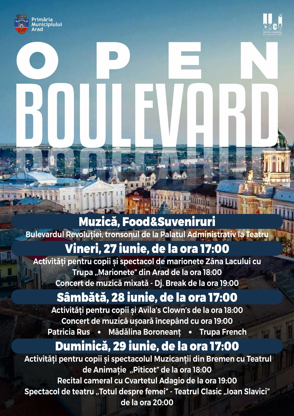 Bulevardul Revoluției, tronsonul de la Palatul Administrativ la Teatru va găzdui evenimentul Open Boulevard, ediția a II-a, care va oferi posibilitatea arădenilor să se plimbe, să servească diverse preparate culinare, să-și achiziționeze suveniruri și să se relaxeze cu programe artistice.